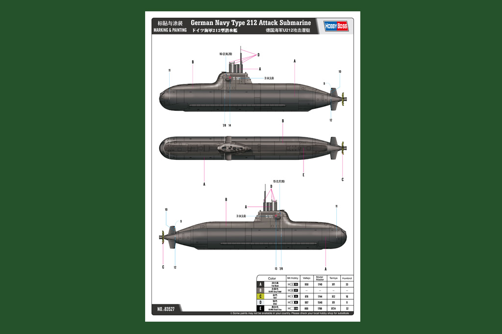 The "German Navy Type 212 Attack Submarine 83527" model kit authentically represents the Type 212 class attack submarine of the German Navy. Developed by Howaldtswerke-Deutsche Werft AG (HDW), this advanced non-nuclear submarine (U-Boot) model is also utilized by the Marina Militare under the name Todaro class. Featuring diesel propulsion and an Air-Independent Propulsion (AIP) system using Siemens Proton Exchange Membrane (PEM) hydrogen fuel cells, this submarine can operate at high speed with diesel or switch to the AIP system for silent slow cruising, staying submerged for up to three weeks without surfacing and without exhaust heat release. The system is reputed to be vibration-free, extremely quiet, and virtually undetectable.