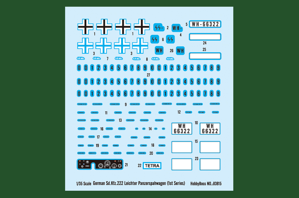 The "German Sd.Kfz.222 Leichter Panzerspahwagen (1st Series) 83815" model kit provides an intricate representation of the German light armored vehicle used during World War II. The Leichter Panzerspähwagen series was a range of light four-wheel-drive armored cars produced by Nazi Germany from 1935 to 1944.