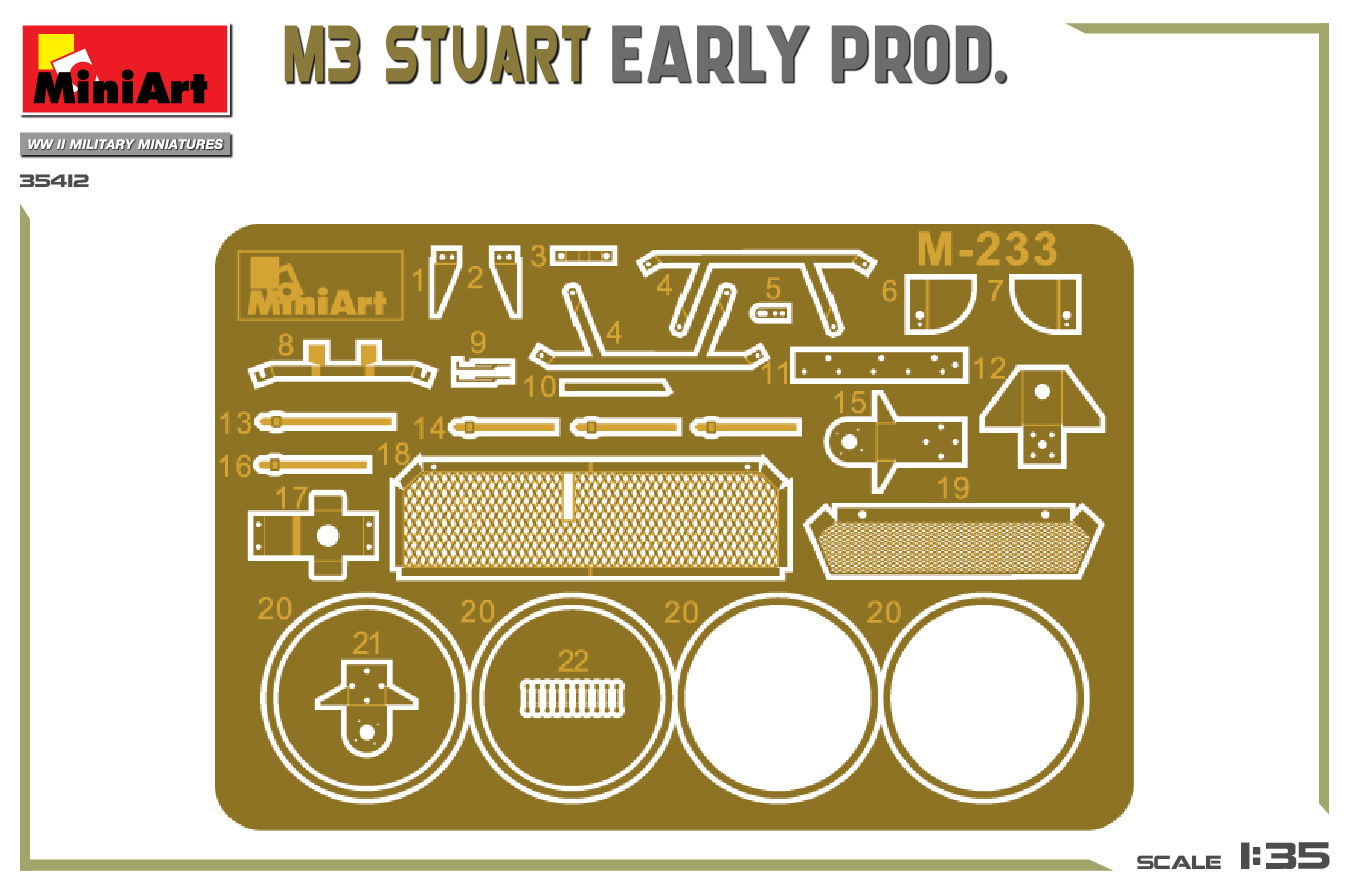 The M3 Stuart - Early Production kit by MiniArt is a detailed reproduction of one of the most iconic light tanks used during World War II. This 1/35 scale model accurately captures the characteristics of the M3 Stuart, allowing modelers to create historically accurate scenes.