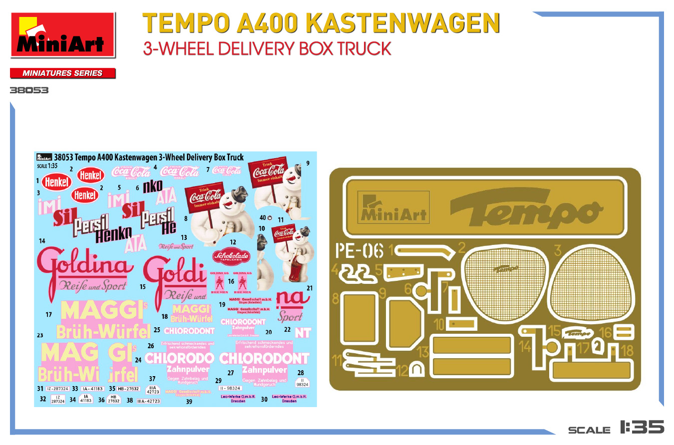- High-Quality Plastic Parts: The kit includes various parts to assemble the Tempo A400 Kastenwagen, known for its unique three-wheel design and box-shaped cargo area.