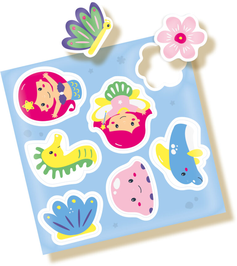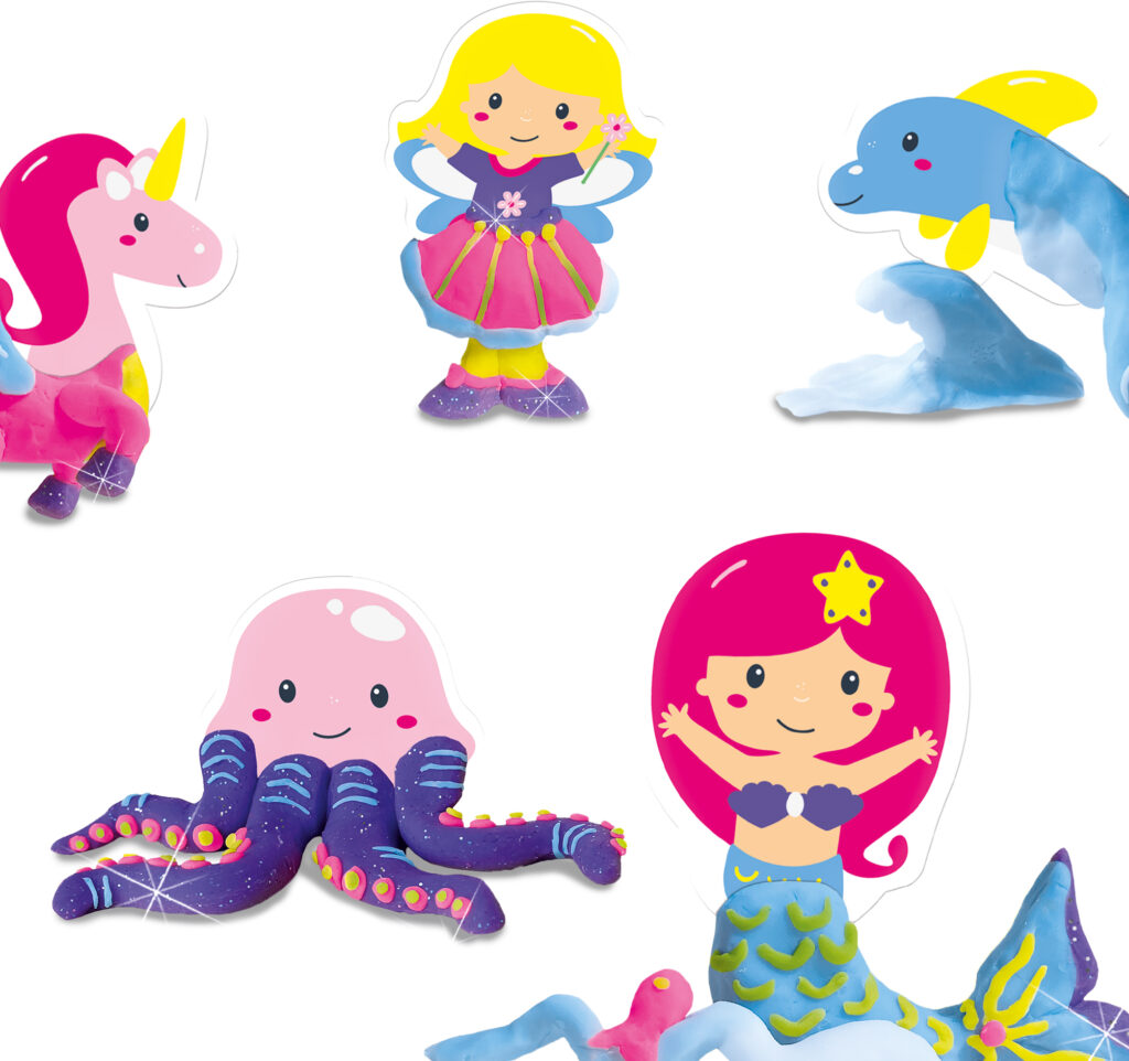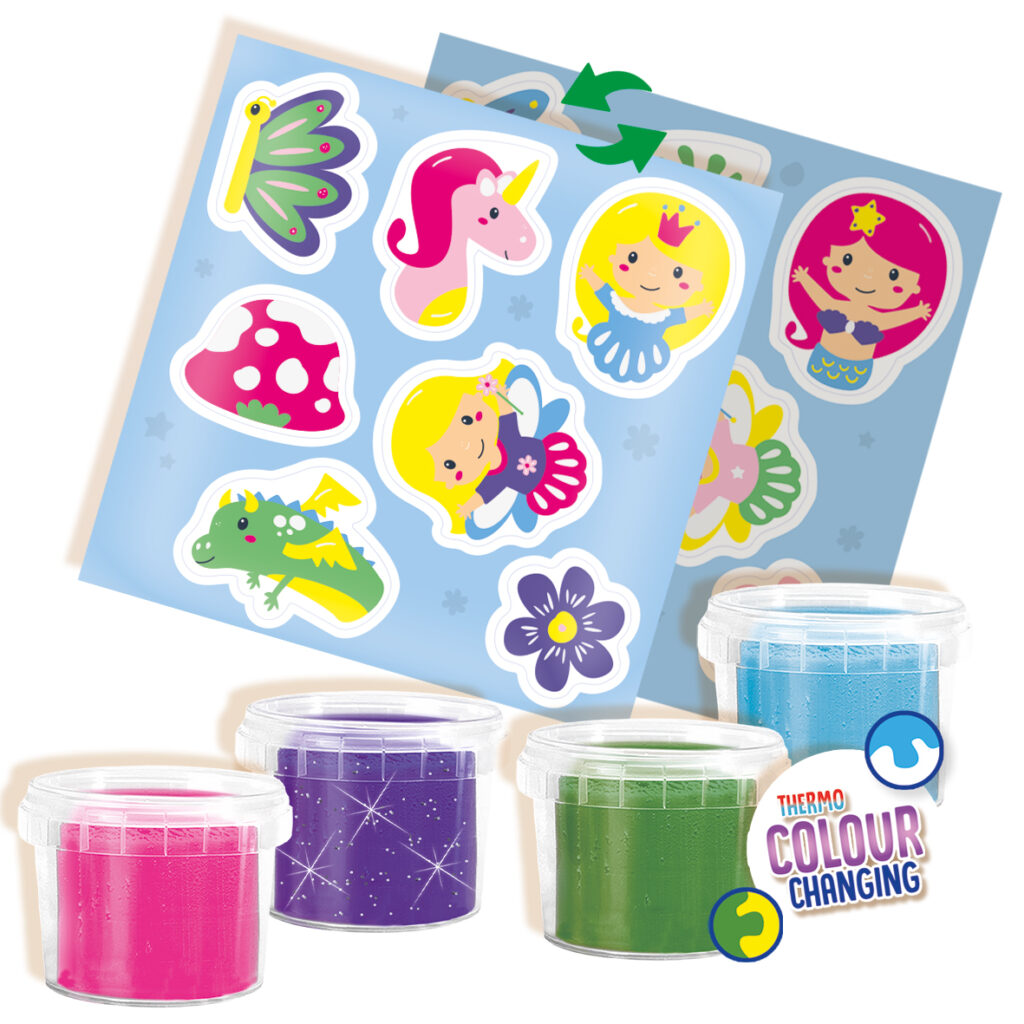 Do you like fairy tales? This kit contains two pots of special modeling clay that change color. It's the warmth of your hands that changes the color of the modeling clay! The kit also includes glitter and neon modeling clays. These four special colors and fun characters bring your fairy tales to life!
