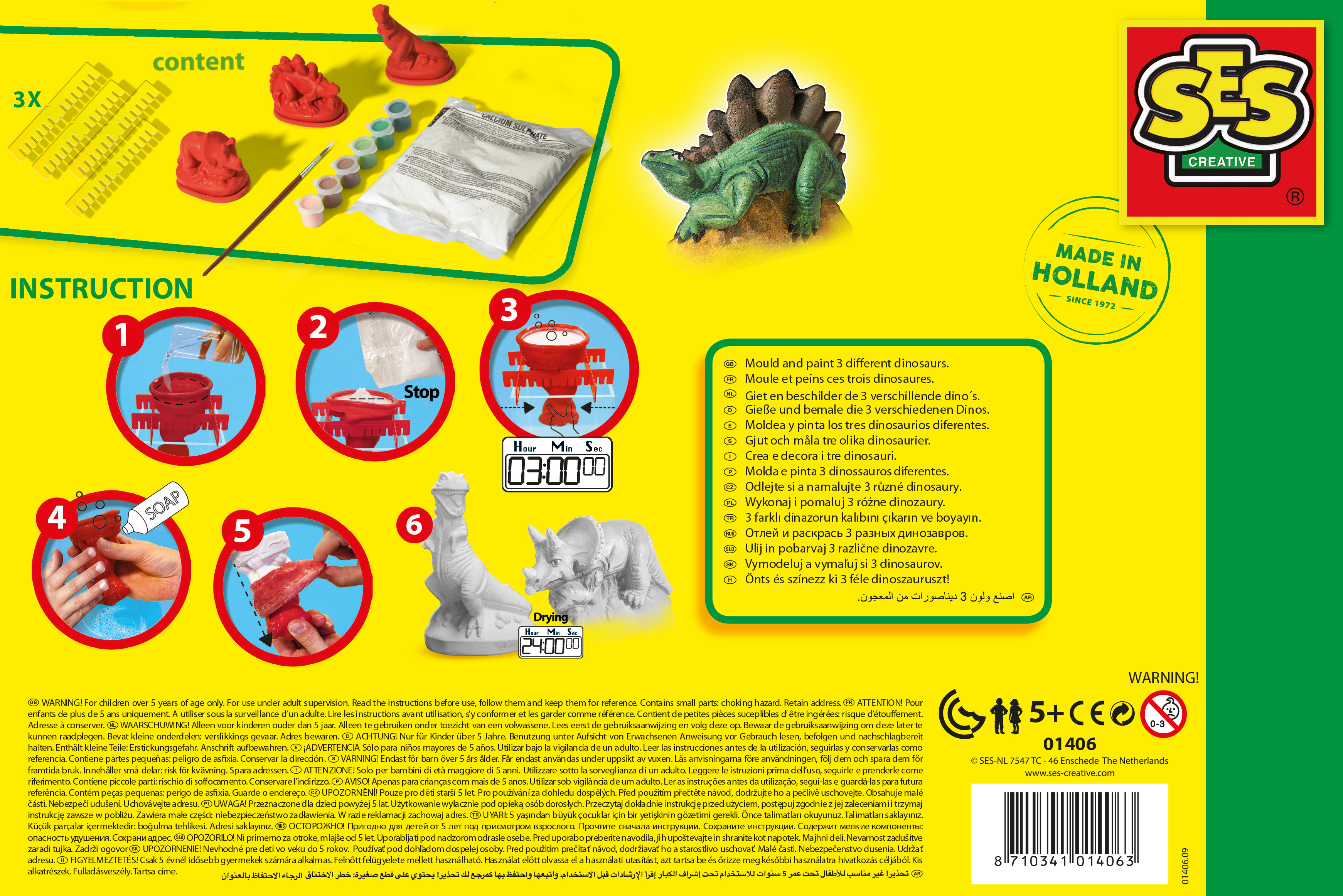 Do you want a super triceratops, a magnificent stegosaurus or even a scary tyrannosaurus in your room? Realize your 3D dinosaurs in plaster … Distribute the plaster in the latex moulds. After drying using the supports provided, unmold your dinosaurs... all you have to do is paint them and put them in your room or offer them as a gift! But what color were they really? We'll never know !