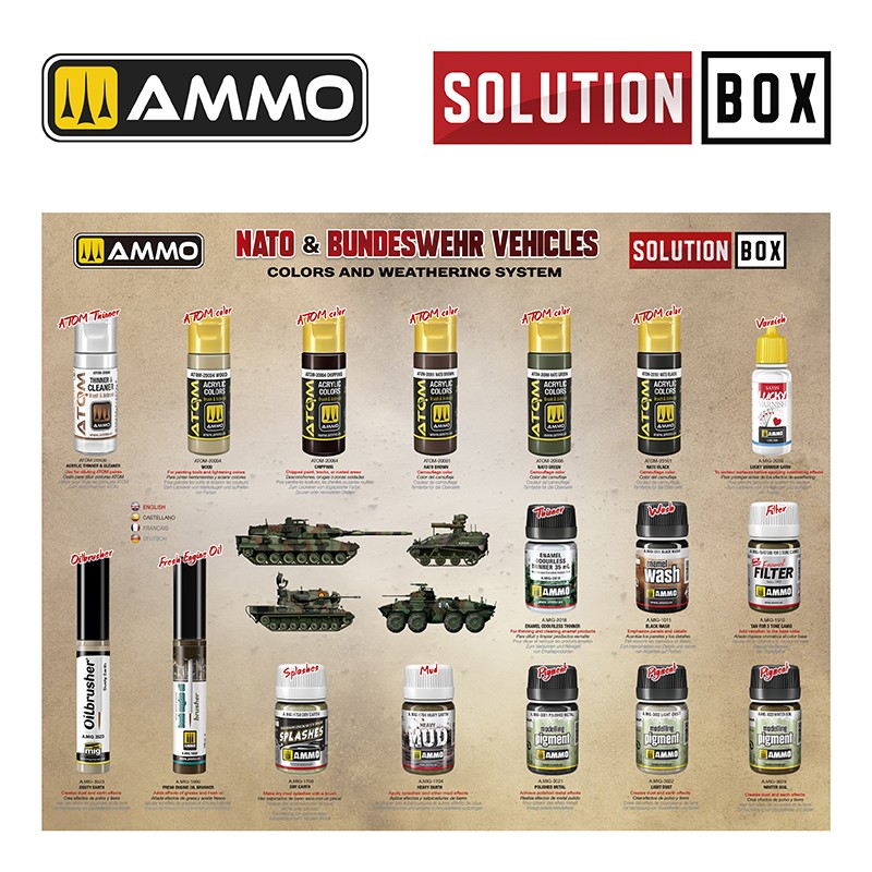 Ce pack contient tout le nécessaire pour recréer ce camouflage classique sur des véhicules comme le Leopard 2, le M1 Abrams, le M60 Patton, le Leclerc, l'AMX-10, le Marder 1, le Boxer MRAV, et bien d'autres. En plus des peintures, vous trouverez des outils et des produits de vieillissement, ainsi qu’un livre de 59 pages (SOLUTION BOOK) qui offre des instructions détaillées en quatre langues (anglais, espagnol, français et allemand) pour peindre et vieillir vos modèles de véhicules OTAN et Bundeswehr.