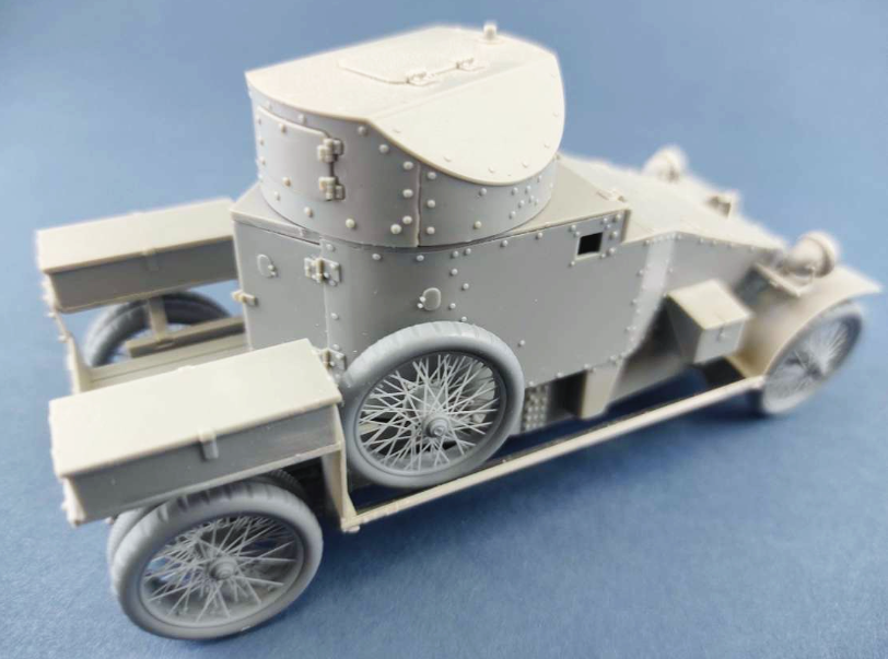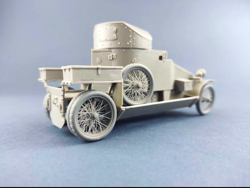 • Un jeu de 6 roues à rayons pour voiture blindée Lanchester : 2 roues à rayons jumelés et 4 roues à rayons simples avec différents protecteurs de pneus