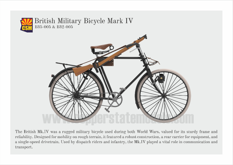 CSM-B32-005 – British Military Bicycle Mark IV est un kit à assembler et peindre à l’échelle 1/32, représentant le vélo militaire britannique Mark IV, un véhicule utilisé par les forces armées lors des deux guerres mondiales. Ce vélo robuste, doté d’un cadre renforcé et d’un porte-bagages arrière, servait notamment aux courriers et à l’infanterie pour assurer des liaisons rapides sur terrain accidenté, transporter du matériel léger ou communiquer entre unités.