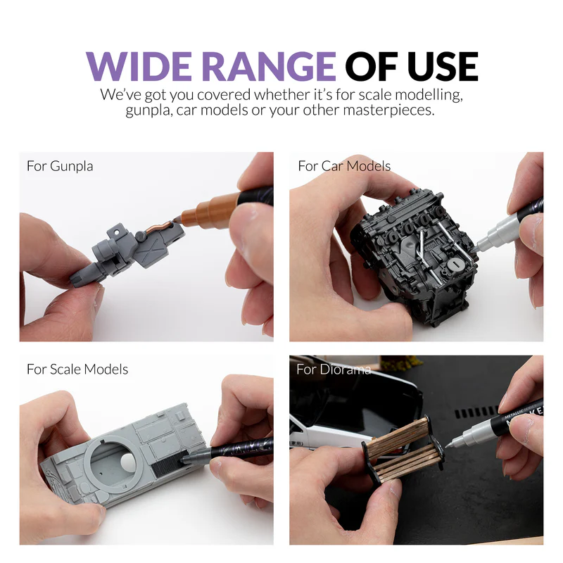 La formule à base de pigments métalliques de haute qualité assure une excellente couvrance, un séchage rapide et une adhérence optimale sur diverses surfaces telles que le plastique, le métal, le bois ou le papier. Ces marqueurs sont parfaits pour ajouter des détails précis ou des effets métalliques réalistes, que ce soit en modélisme, en personnalisation ou en loisirs créatifs.