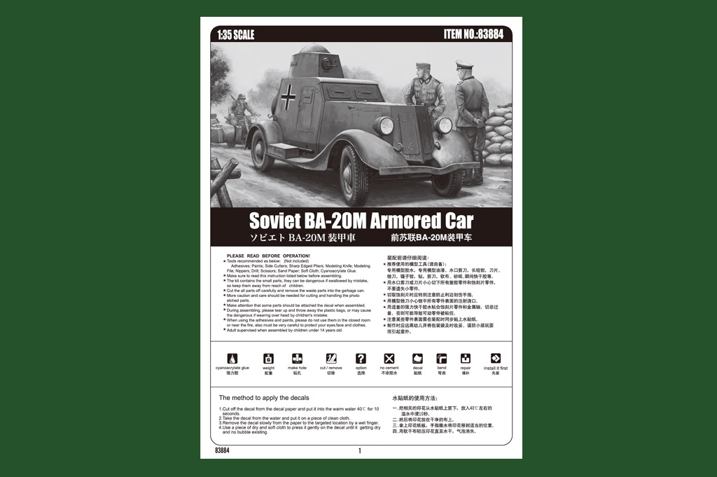 La maquette "Soviet BA-20M Armored Car 83884" offre une reproduction détaillée du véhicule blindé soviétique BA-20M utilisé pendant la Seconde Guerre mondiale. Le BA-20M était un véhicule de reconnaissance léger, largement déployé sur divers fronts. Avec sa conception robuste et son armement modeste, il a joué un rôle crucial dans les opérations de reconnaissance et de soutien.