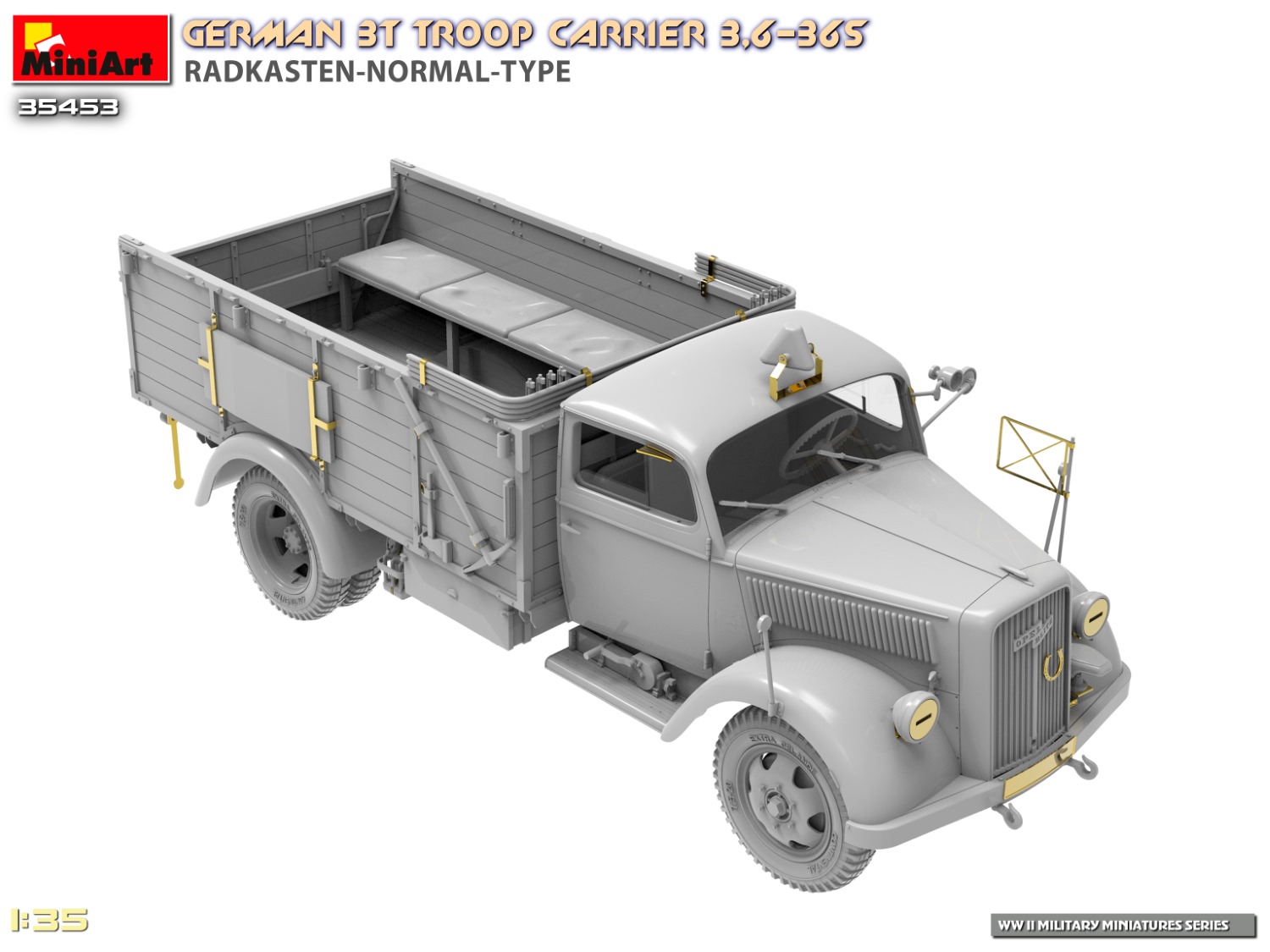 Ce kit représente un camion de transport de troupes allemand de 3 tonnes, modèle 3,6-36S, dans sa version avec ailes de roues standards ("Radkasten-Normal-Type"). Ce type de véhicule fut massivement utilisé par la Wehrmacht pour le transport de personnel, d’équipement et de munitions sur tous les fronts.