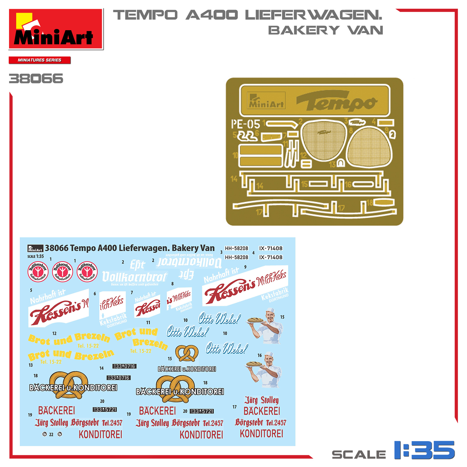 Le kit de modèle TEMPO A400 LIEFERWAGEN - Fourgon de boulangerie est une représentation hautement détaillée de ce véhicule de livraison emblématique. Le kit comprend des pièces en plastique transparent, des pièces photo-découpées et une planche de décalcomanies avec des options pour 5 livrées différentes. De plus, le kit comprend des plateaux à pain avec des pains détaillés, ajoutant du réalisme à la scène. Les portes du fourgon peuvent être assemblées en position ouverte ou fermée, permettant une personnalisation supplémentaire dans vos dioramas ou présentations.
