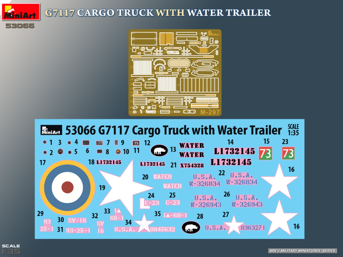 La référence MINI53066 – G7117 Cargo Truck with Water Trailer propose la reproduction à l’échelle 1/35 d’un camion cargo américain de la série Chevrolet G7117, accompagné d’une remorque citerne à eau.
