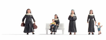 Contenu : L'ensemble comprend 4 religieuses en habit religieux avec 2 enfants, dont une priant, une assise (sans banc), une avec un enfant, et une avec un bagage léger. Chaque figurine miniature debout mesure environ 2,2 cm de hauteur et est en plastique. Les modèles, peints à la main avec amour, sont très détaillés et apportent personnalité et expression.