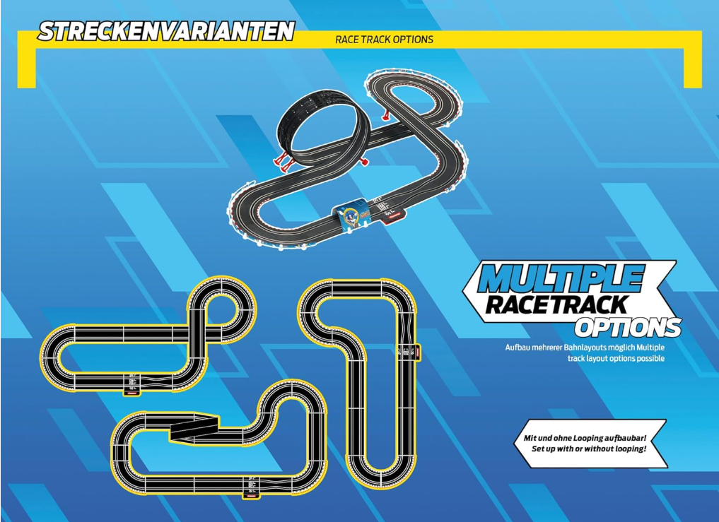 Panneaux : Vivez des sensations fortes avec nos circuits Carrera. Des virages à grande vitesse aux boucles astucieuses, créez votre propre circuit et mesurez-vous avec vos amis ou votre famille dans des courses captivantes. Grâce à notre technologie de rail précise, nos pistes sont non seulement robustes, mais offrent également une sensation de course incroyablement réaliste.