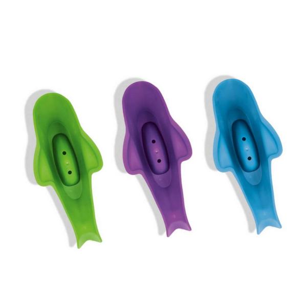 Laissez les trois poissons plonger dans le bain chaud et regardez la couleur des poissons ! Le poisson vert devient jaune, le violet devient rose et le bleu devient blanc ! avec ces trois poissons aux couleurs changeantes, tu vas t'amuser pendant des heures dans le bain. Tu peux les empiler, les echanger l'un apres l'autre, mais aussi les utiliser comme une pelle ou une passoire. Dans l'eau chaude du bain, ils ont toujours une couleur differente de celle de l'exterieur, magique !