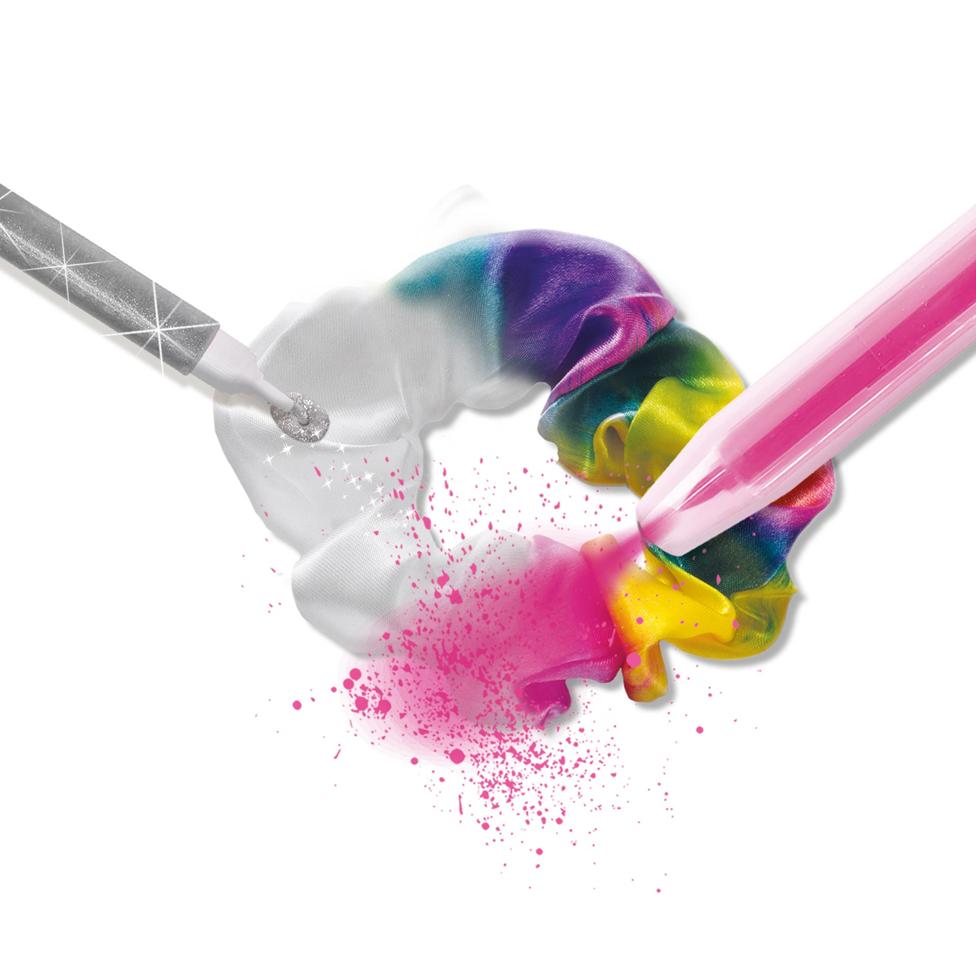 Est-ce que ce n’est pas génial de décorer tes propres chouchous ? Un incontournable pour toutes les fans de mode ! Le kit se compose de deux chouchous et de deux rubans. Avec les quatre feutres aérographes de couleur à souffler et la colle à paillettes, réalise les créations, les motifs et les effets les plus cool !