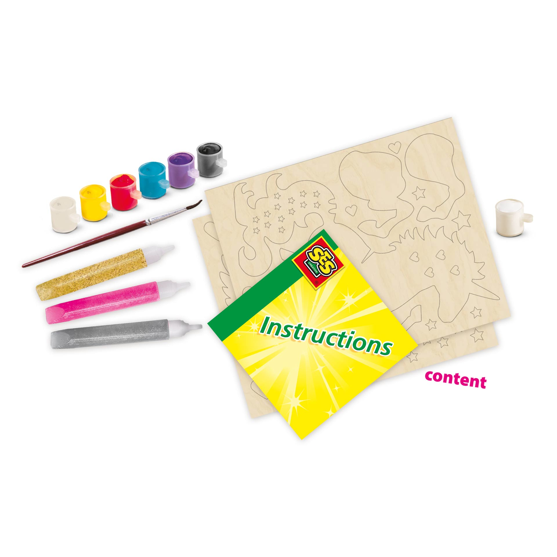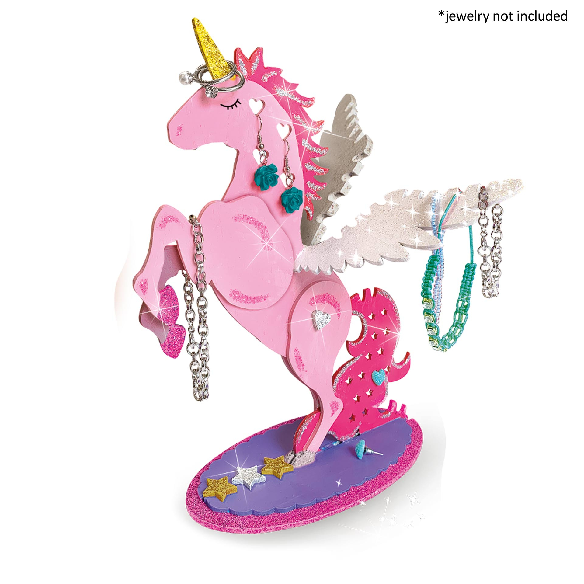 Tu veux ranger tous tes bijoux au même endroit et leur attribuer une place de choix dans ta chambre ? Cette licorne possède des trous et des bords pratiques pour accrocher tes bagues, boucles d’oreilles, bracelets et colliers. Assemble les pièces en bois et décore-la avec les six couleurs de peinture et les trois couleurs de colle à paillettes ! Quelle couleur de licorne convient le mieux à ta chambre ?