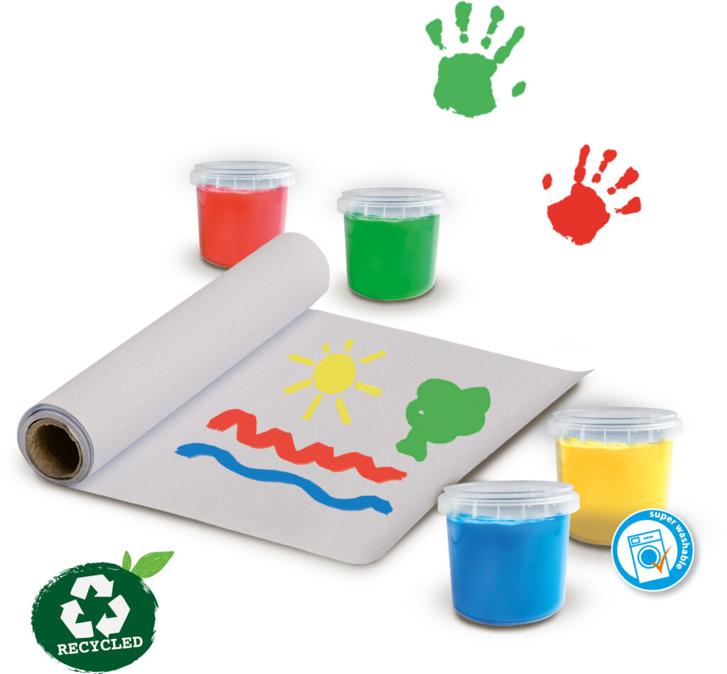 Ce kit de peinture au doigt ECO contient différentes couleurs de peinture au doigt, un tablier d’activité et un rouleau de papier recyclé que tu peux utiliser pour créer de magnifiques œuvres d’art. Choisis la couleur qui te plaît et dessine avec tes doigts. Tu n’as pas à t’inquiéter de salir tes vêtements, car le tablier ECO inclus dans le kit te mettra à l’abri des taches. Le tablier est fabriqué à partir de bouteilles en PET 100 % recyclées et est spécialement conçu pour notre gamme ECO.