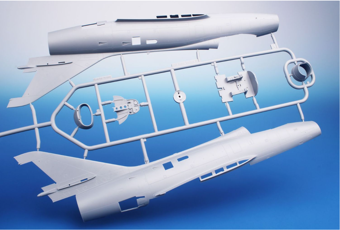 • Grappes de pièces en plastique injecté pour assembler la cellule, les ailes, le fuselage, le train d’atterrissage et les empennages.