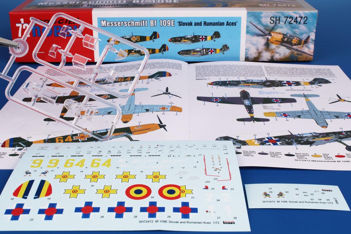 Le modèle haut de gamme du Messerschmitt Bf 109E est ici dans un autre reboxing offrant des décalcomanies pour deux pilotes as slovaques et deux de Roumanie - et ces derniers sont aussi ceux avec les machines les plus accrocheuses dans la boîte. La vie et le destin des pilotes sont également décrits dans les quatre jeux de couleurs.