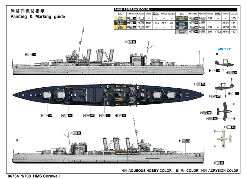 Le HMS cornwall fini en 1928 dans le chantier naval de Davenport, modernisé en 1935-38 et est ensuite resté en service jusqu'en 1941 dans la flotte locale. 1941-42 a servi dans la Royal Navy à l'Est pour combattre avec la flotte japonaise. Le HMS cornwall a finalement coulé le 5 avril 1942 par la First Air Flotilla japonaise dans les eaux au sud-ouest de Ceylan, à Colombo.